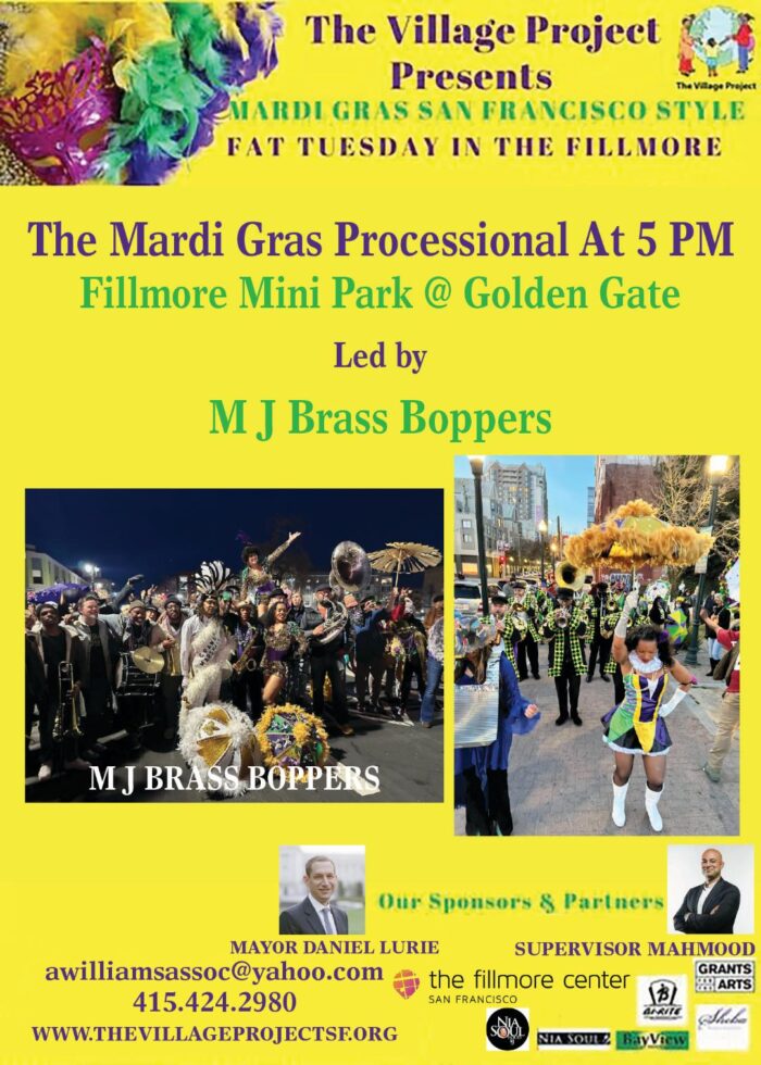 The Village Project proudly announces the 20th Annual Mardi Gras San Francisco Style, returning to the Fillmore District on Tuesday, February 17, 2026, for an evening of culture, music, and community celebration. Now in its second decade, this signature event continues to honor the rich traditions of New Orleans while uplifting the legacy of the Fillmore as a historic center of Black art, music, and community life.
